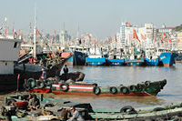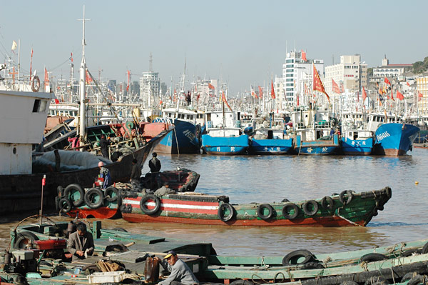 Zhoushan selbst ist eine Stadt der Superlative: Sie liegt, mit dem Festland über eine 27 km lange Brücke verbunden, auf der gleichnamigen Insel mit gleich mehreren Häfen und ist mit 524 qkm die größte von 1339 Inseln im Ostchinesischen Meer. Diese Zhoushan-Inselgruppe wiederum ist die größte Inselgruppe Chinas und für Urlauber ein Sonnen- und Strandparadies. Und noch eine Superlative: Hier liegt Chinas größtes Fischfanggebiet – mit rund 380 (!) Fischarten und diesen köstlichen „Top 3“: Gelb-, Tinten- und Bandfisch! 70.000 Fischer – einige von ihnen malen in ihrer Freizeit sogar höchst professionell und abstrakt Motive ihres Beutefangs – holen mit ihren Netzen Jahr für Jahr rund eine halbe Million Tonnen (= 500 Millionen Kilo) Fische aus dem Ostchinesischen Meer. In 60 Fisch-Restaurants allein an der Hafenpromenade werden die Delikatessen abends Gästen frisch serviert.