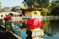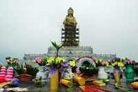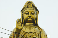 Über allem steht segnend Guanyin, die Göttin der Barmherzigkeit. Sie ist die größte Attraktion der Zhoushan-Inselgruppe! Auf der 12,5 qkm großen Insel Putuo mit Badestränden und dichten Bambushainen erhebt sich Chinas einziger heiliger, 291 Meter hoher Inselberg, der buddhistische Putuo Shan, offiziell „Putuoshan National Park“ benannt. Dort ragt über 30 Meter hoch die vergoldete Bronzestatue der Göttin empor. Während sie ihre rechte Hand segnend über die Pilger hält, liegt in ihrer linken ein Schiffssteuerrad, weil sie auch als Schutzpatronin der Fischer und Seefahrer verehrt wird. Das erste Kloster wurde hier bereits im 11. Jahrhundert gegründet, heute stehen mehr als 20 Tempel und leben mehrere hundert Mönche in den drei großen und 88 kleinen Klöstern auf Putuo Shan.